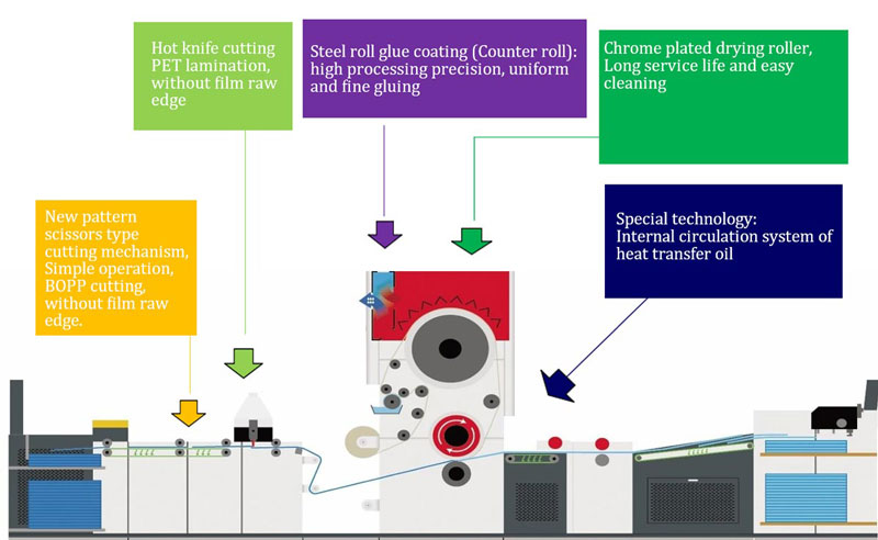 Adota tecnologia de rolo de desenho de papel de elevação unidirecional (unidirecional), adequada para corte de laminação de filme de alta velocidade de vários tamanhos, com efeito estável, operação simples e sem borda crua do filme;