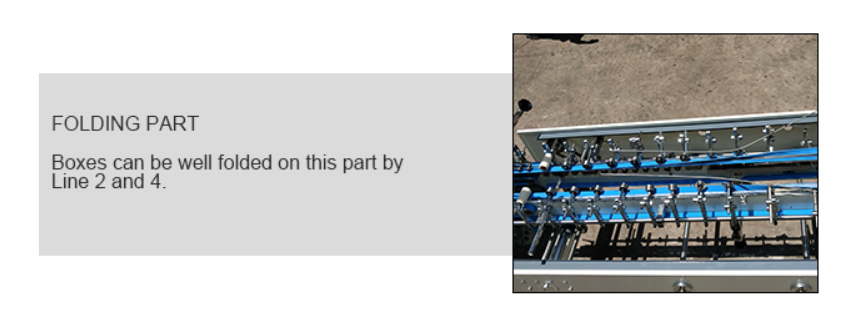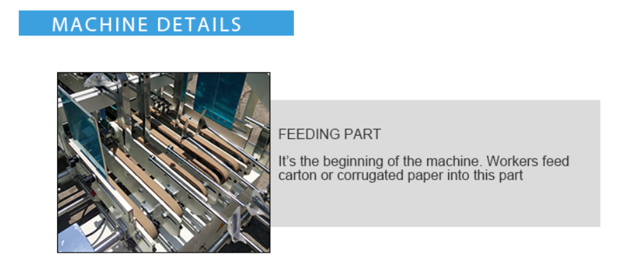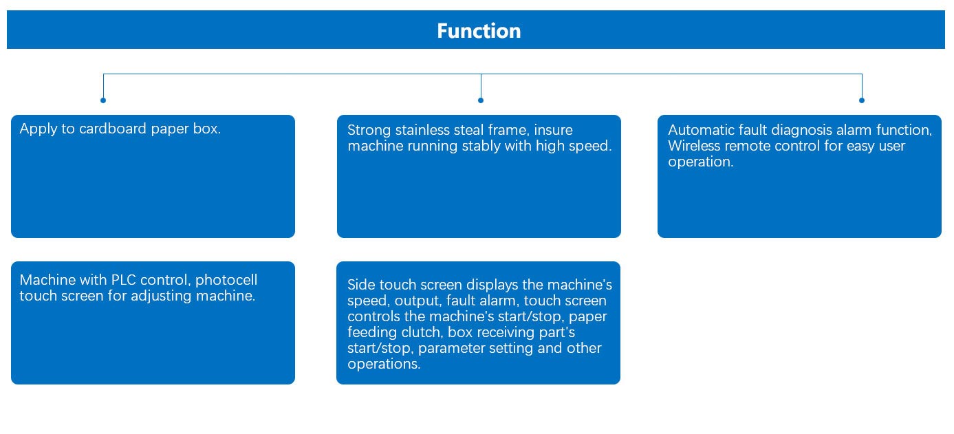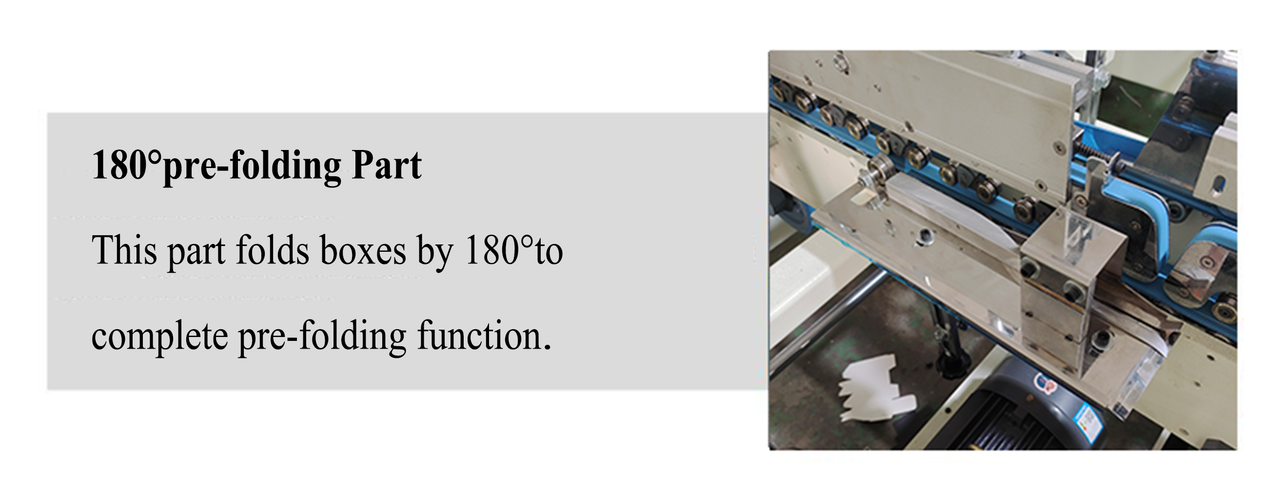 É amplamente utilizado em alimentos, medicamentos, cosméticos, artigos de papelaria e outras caixas comuns, processando e colando todos os tipos de caixas pré-dobradas. A pré-dobragem pode ser aplicada à embalagem automotiva, com as dobras 1 e 3 da caixa processada alcançando ângulos de 180° e 135°, atendendo perfeitamente aos requisitos da embalagem automática. (Podemos personalizar em outros tamanhos).