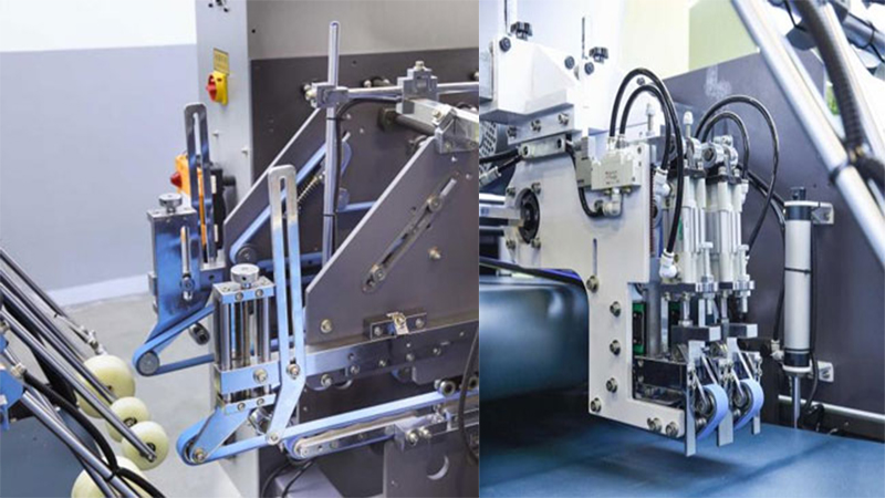 Sensores e guias garantem alinhamento preciso para evitar erros de dobra ou aplicação incorreta de cola.